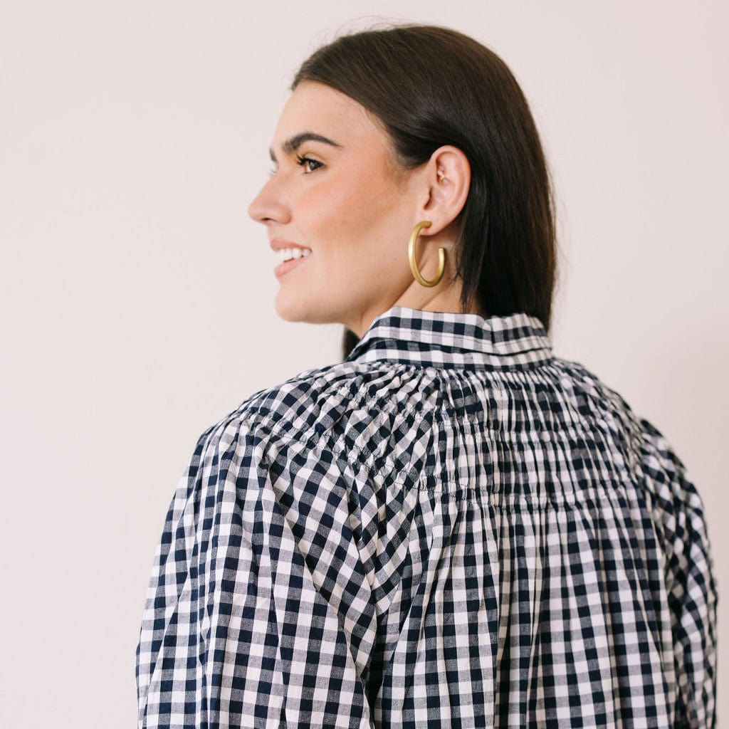 The Navy Gingham Oasis Dress blends timeless charm with effortless elegance. Featuring a button-down design, puff sleeves, and soft cotton gingham, it’s perfect for a breezy day out or a cozy evening gathering.